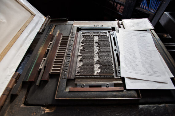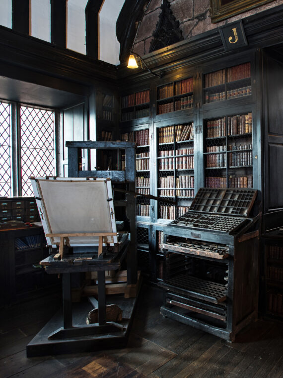 The wooden hand printing press now standing in Chetham’s Library is believed to date in part from the early seventeenth century. It was donated to the Library in 1900 by George Falkner and Sons, printers of Deansgate, Manchester, along with some additional equipment including a type-casting mould, printing ink balls, a typecase and compositor’s stick.